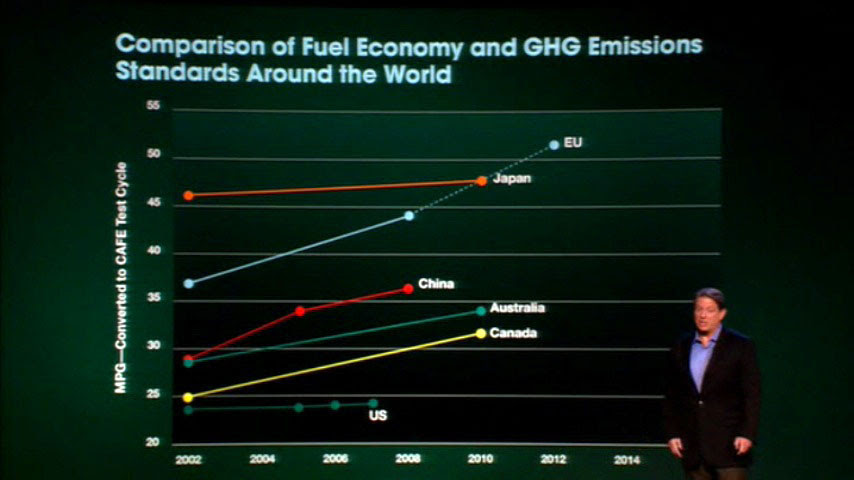 California proposes standards that exceed US national standards. US car manufacturers suing California, saying targets are unreachable in 10 years -- despite manufacturers in other countries already doing it now.